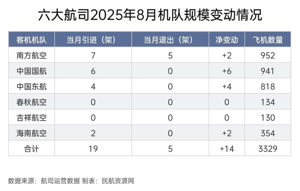 圖:六大航司2025年8月機隊規模變化情況 制圖:民航資源網