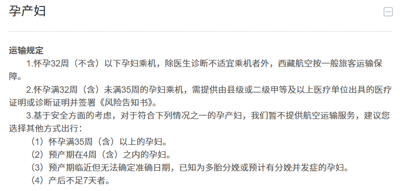 以西藏航空為例,對於懷孕35周以下的孕婦,懷孕不足32周的,除醫生診斷不適宜乘機者外,按一般旅客運輸;懷孕滿32周但不足35周的孕婦,需提供縣級或二級甲等以上醫療單位出具的醫療證明,並簽署風險告知書;若懷孕超過35周則禁止乘機。此外,對於産後不足7天的産婦,也禁止乘機。