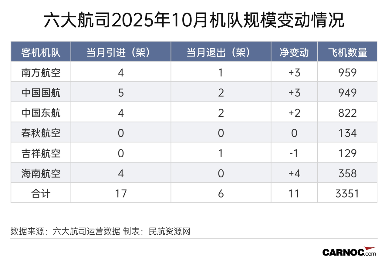 圖:六大航司2025年10月機隊規模變動情況 制圖:民航資源網
