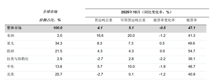 國際航空運輸協會(IATA,簡稱“國際航協”)2025年10月全球航空貨運需求定期數據顯示: