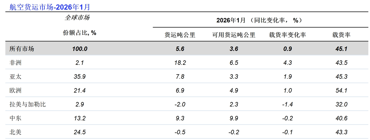 國際航空運輸協會(IATA,簡稱“國際航協”)2026年1月全球航空貨運需求定期數據顯示: