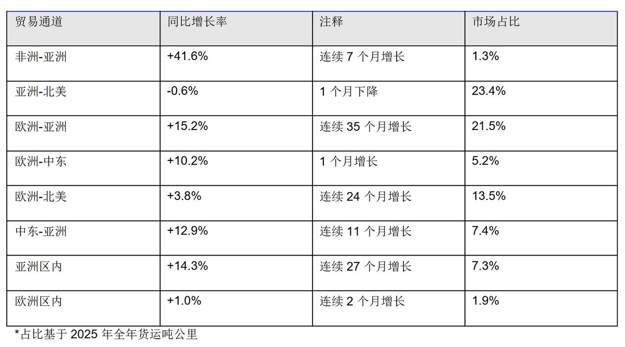 2026年1月,除亞洲-北美航線下跌,大多數主要貿易通道的航空貨運量均實現增長。