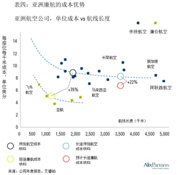 廉航的上述成本優勢,並非全都可以擴展應用在長途航線上運營中。通過對已知的運作模式研究,我們可以推斷在現有的廉價航空的成本結構中有具體哪幾種優勢同樣適用於長途的業務模式。廉價航空的高生產力難以維持,原因在於廉價航空的人員工作時間已達到極限,飛機也面對著周轉時間和機場宵禁的限制。然而,除此之外的其他優勢仍然適用,具體而言,是較低的絕對員工成本及機場、裝卸等服務費用。在此基礎上,亞洲的廉價航空仍可以在長途航線上相對於傳統航空保留大概20%左右的成本優勢 (見表四)。