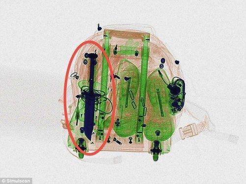 義大利Simulscan公司為X射線掃描的工作人員提供培訓,他們提供了一些圖片。這些圖片涉及了8種違禁物品,包括強制、刀具和噴霧罐。八組圖片每組有兩張,第一張顯示的是X光掃描出的行李箱圖片,而第二張則圈出了代表違禁物品的形狀。