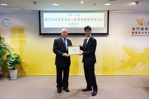 澳門國際機場自1995年12月8日開始營運至今二十年,有關政府部門一直配合機場工作,為「安全、效率、效益」作出了巨大的貢獻。為此,2016年4月29日,澳門國際機場專營股份有限公司(CAM)舉行表彰儀式,向長期協助機場運作的有關政府部門予以表彰。澳門國際機場及有關政府部門代表參加了此次儀式。