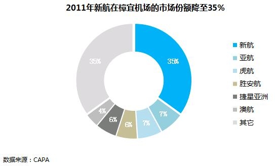 2000年,新航在樟宜機場的市場份額是50%。2011年,新航在樟宜機場的市場份額降至35%,外加全資子公司勝安航空,新航集團的市場份額是41%;排名第二位的是澳航外加子公司捷星亞洲,市場份額合計10%;憑借7%的市場份額,亞航排名第三位。