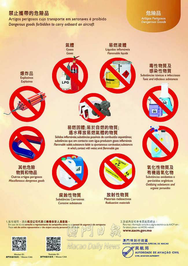 民航局於昨日起在機場展示新的受 保安管制物品和危險品的宣傳品