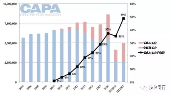 2009年,低成本航企在日本和韓國之間的市場上僅占了1%的可用座位量,2016年份額達到了37%,2017年到目前為止已占了市場49%的份額。據來自機場的少量資料顯示,載客率更高的低成本航企乘客量已超過了全服務航企。到2017年底,此類航企應能輕鬆地在此市場占多數運力份額。低成本航企運營的機場配對航線數量已經超過了全服務同行。這些航企在日-韓市場的發展體現出東北亞市場具備低成本航企成長的土壤,也凸顯出航空自由化的重要性以及全服務航企擁有高效成本基數的重要性。