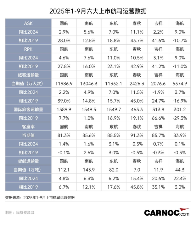 圖:2025年前三季度六大上市航司主要運營數據 制圖:民航資源網