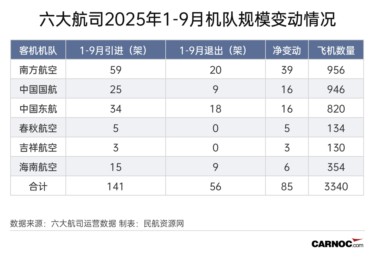 圖:六大航司2025年1-9月機隊規模變動情況 制圖:民航資源網