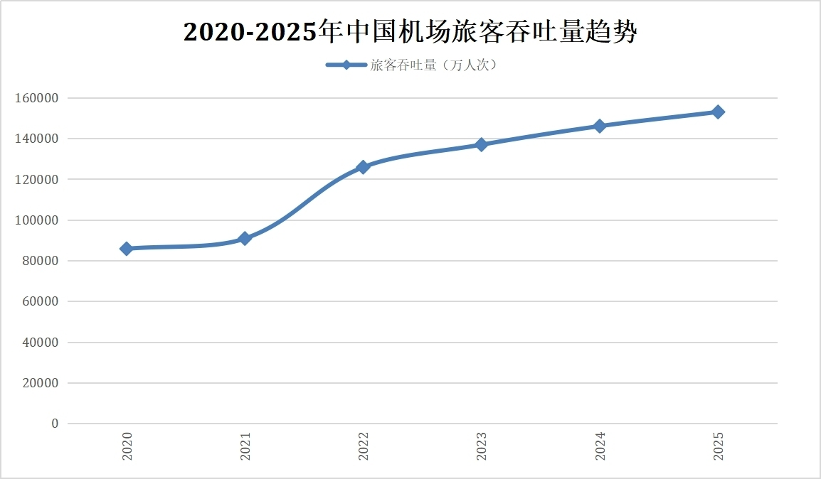 2025年,中國民航業展現出強勁的復甦勢頭,境內機場合計完成旅客吞吐量15.29億人次,同比增長4.8%,這一增幅不僅高於全球平均水平,也標志著中國航空市場已全面恢復至疫情前水平並實現新的突破。從歷史數據對比來看,這一成績尤為顯著:2019年(疫情前)中國機場旅客吞吐量為135162萬人次,2025年數據已較疫情前增長13.3%,反映出中國航空市場長期增長的韌性和潛力。
