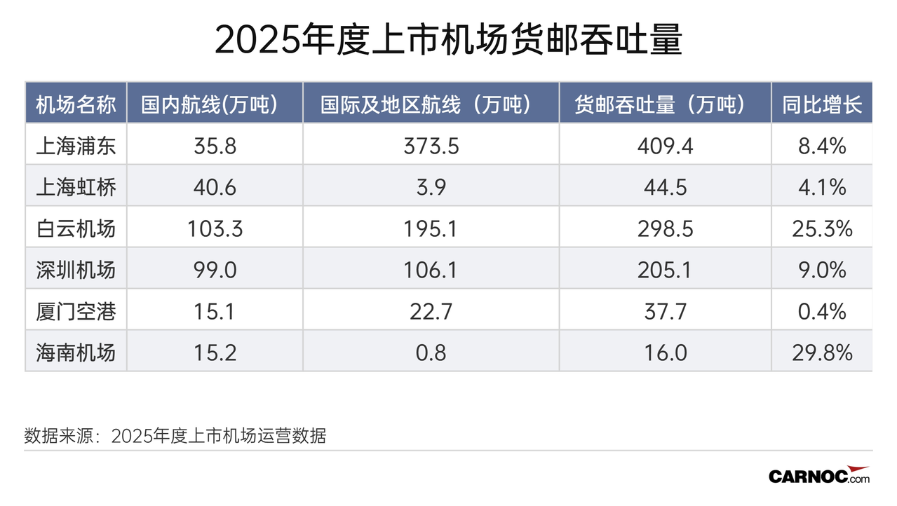 2025年,以上海機場、白雲機場、深圳機場、廈門空港、海南機場等5家上市機場為代表的行業頭部力量,在2025年合計完成貨郵吞吐量約1011.22萬噸,為行業發展提供了堅實支撐。尤為值得關注的是,國際市場已成為推動航空貨運增長的核心驅動力。上述5家機場在2025年的國際及地區航線貨郵吞吐量達到了驚人的638.47萬噸,佔其總貨郵吞吐量的比重高達63%。這一結構性變化標志著中國航空物流體系正從過去以國內循環為主的模式,向內外雙循環協同發展的國際化格局加速演進。國際航線的強勁復甦,預示著中國在全球供應鏈中的角色正在從“世界工廠”向“全球樞紐”轉變。
