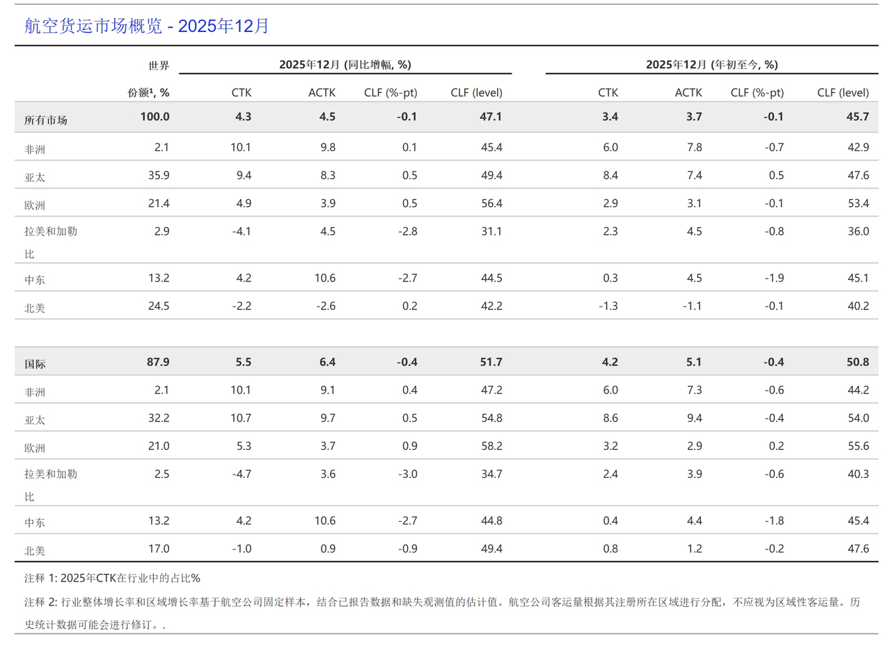 國際航空運輸協會(IATA,簡稱“國際航協”)2025年全年和2025年12月全球航空貨運需求定期數據顯示: