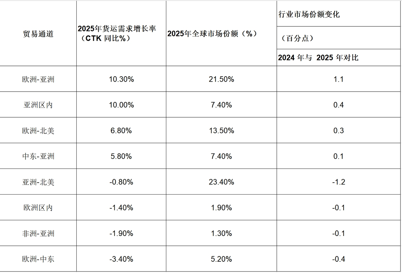 •2025年全年總需求(貨運噸公里,CTK)同比2024年增長3.4%(國際需求增長4.2%)。